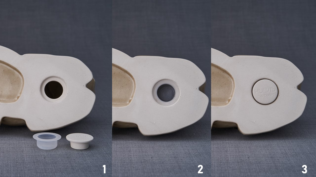 Nous vous recommandons de sceller le capuchon en céramique sur le couvercle en plastique une fois le couvercle inséré dans l'urne pour garantir qu'il reste en place. Veuillez noter que le capuchon en céramique n'est parfois pas complètement hermétique.